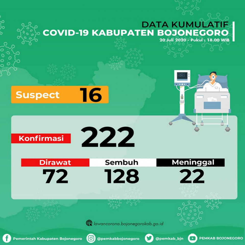 "Jumlah kasus confirm kumulatif hari ini sebanyak 222 orang, meliputi yang dirawat 72 orang, sembuh 128 orang dan meninggal dunia 22 orang." kata Masirin.