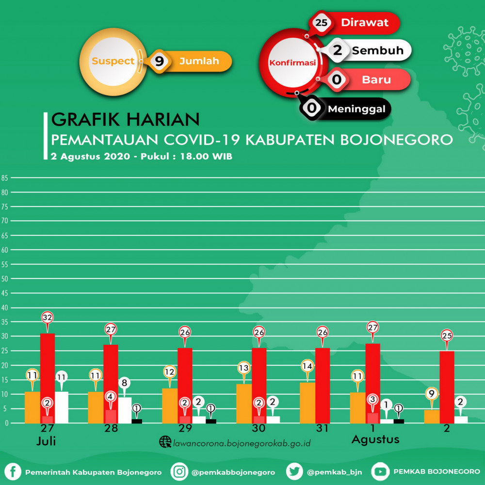 Update Corona Bojonegoro 2 Agustus: Suspect 9, Confirm 246, Dirawat 25, Sembuh 194, Meninggal 27
