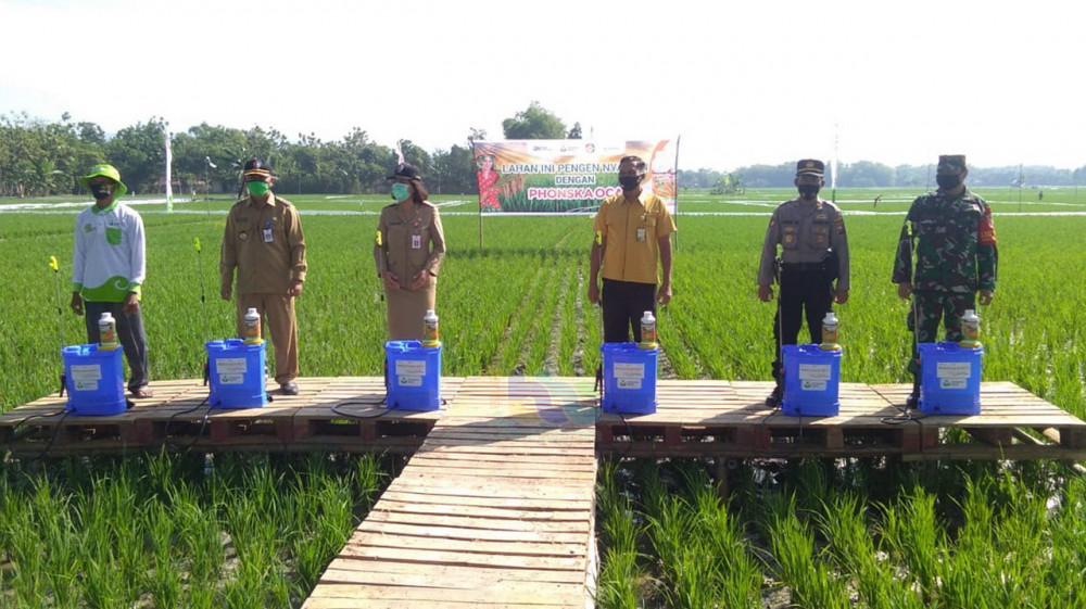 Kepala Dinas Pertanian Kabupaten Bojonegoro, bersama perwakilan Petrokimia Gresik dan Forpimca Kanor, saat foto bersama jelang acara penyemprotan bersama pupuk organik cair, di Kecamatan Kanor Bojonegoro. Senin (03/08/2020)
