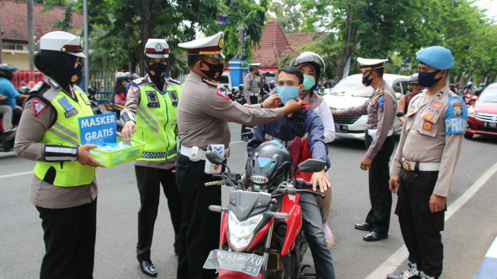 Anggota Polres Bojonegoro saat laksanakan pembagian masker kepada pengendara kendaraan bermotor di Bojonegoro. Selasa (04/08/2020)