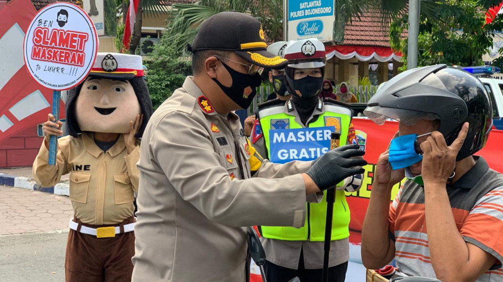 Kapolres Bojonegoro, AKBP M Budi Hendrawan SIK MH, saat laksanakan pembagian masker kepada pengendara kendaraan bermotor di Bojonegoro. Rabu (05/08/2020)