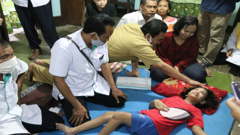 Blora - Wakil Bupati Blora, H Arief Rohman MSi, bersama Dinsos P3A, Baznas dan Balai Besar Rehabislitasi Sosial Penyandang Disabilitas Fisik (BBRSPDF) Prof Dr Soeharso Surakarta, pada Senin (10/08/2020) sore, kunjungi rumah Alenda Primavea Dewi (11), anak penyandang disabilitas yang belum bisa berjalan normal sejak bayi hingga saat ini.