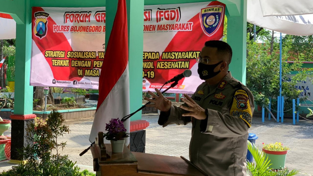 Bojonegoro - Polres bersama jajaran Forkopimca Bojonegoro Kota dan Tim Gugus Tugas Penanganan Covid-19 Desa Campurejo Kecamatan Bojonegoro Kota, pada Rabu (12/08/2020), menggelar diskusi yang dikemas dalam Focus Group Discussion (FGD), yang bertujuan untuk meningkatkan pemahaman dan memperdalam pengetahuan, serta untuk memompa semangat bersama-sama dalam menangani virus Corona (Covid-19).