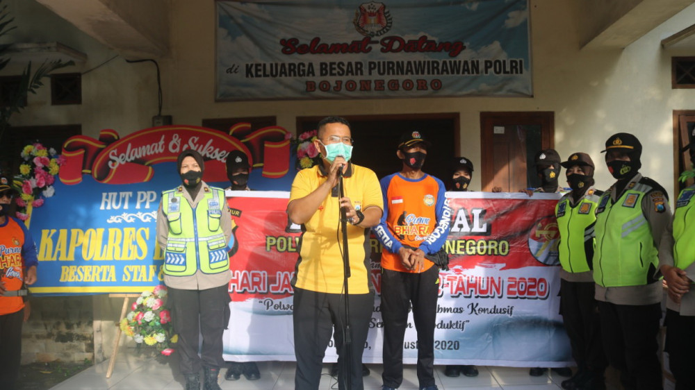 Kapolres Bojonegoro, AKBP M Budi Hendrawan SIK MH, saat beri sambutan dalam acara 'Gowes Kemerdekaan' dalam rangka Hari Jadi Persatuan Purnawirawan (PP) Polri ke-21. Sabtu (15/08/2020)