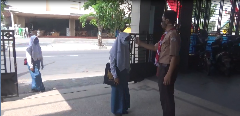 1). Siswa dengan memakai masker dan jaga jarak sebelum memasuki ruangan sekolah, dilakukan tes suhu badan dengan alat thermogun oleh petugas kemananan sekolah (security);