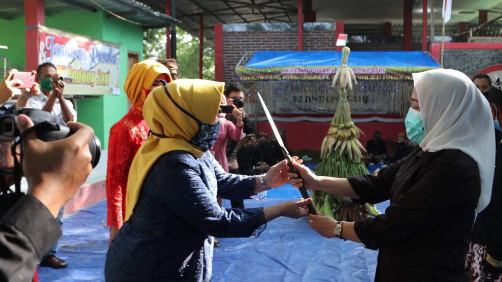 Bupati Bojonegoro, saat serahkan pusaka peninggalan Ki Andong Sari, kepada kepala Kelurahan Ledok Kulon, sebagai simbol dilaksanakan Kirab Pusaka Ki Andong Sari. Selasa (01/09/2020),