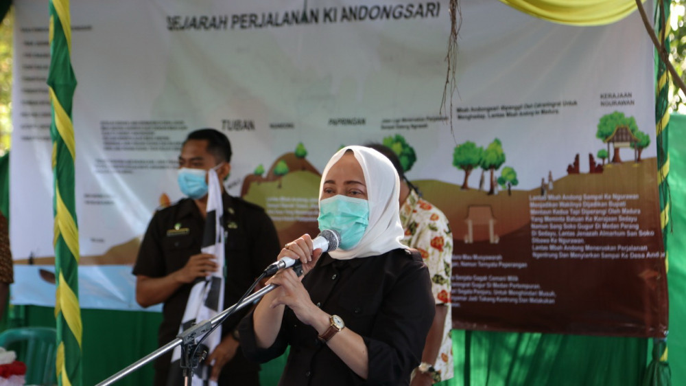 Bupati Bojonegoro, Dr Hj Anna Muawanah saat beri sambutan dalam acara Kirab Pusaka Ki Andong Sari, di Makam Ki Andong Sari, di Kelurahan Ledok Kulon Kecamatan Bojonegoro Kota. Selasa (01/09/2020),