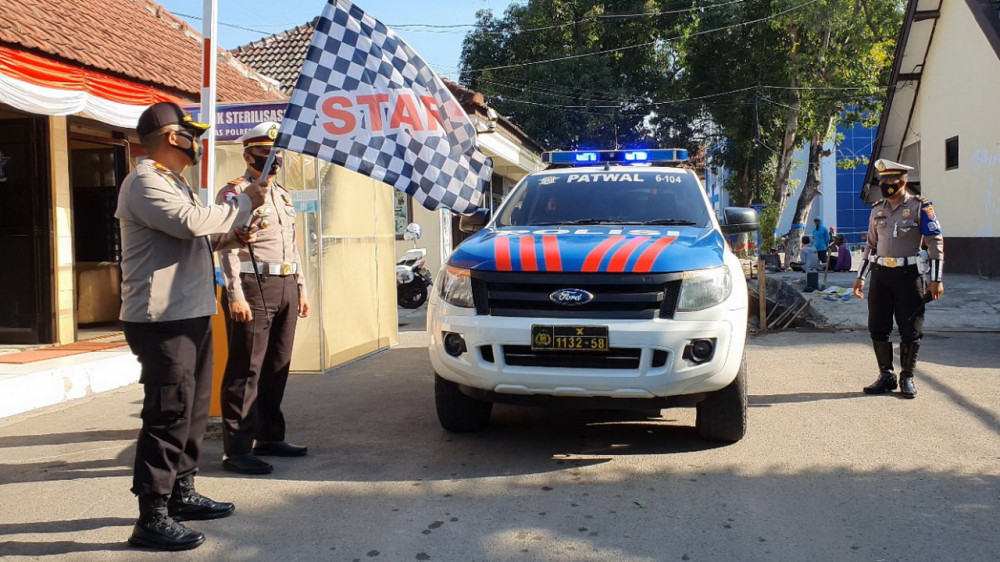 Kapolres Bojonegoro, AKBP M Budi Hendrawan SIK MH saat berangkatkan rombongan truk distribusi air bersih, dari Mako Sat Lantas Polres Bojonegoro. Selasa (08/09/2020)