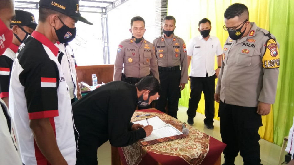 Ketua Perguruan Pencak Silat tingkat Ranting Kecamatan Kedungadem, saat tandatangani . ikrar janji untuk menciptakan persaudaraan dan kerukunan antar anggota pencak silat, demi terciptanya kamtibmas di Bojonegoro.