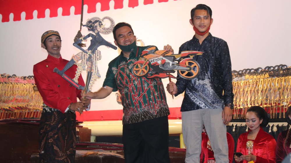 Wakil Bupati Blora, H Arief Rohman MSi, saat serahkan tokoh wayang kepada dalang Ki Sigid Ariyanto. di Kampung Pelangi Desa Wisata Bangsri Kecamatan Jepon Blora. Rabu (09/09/2020) malam.