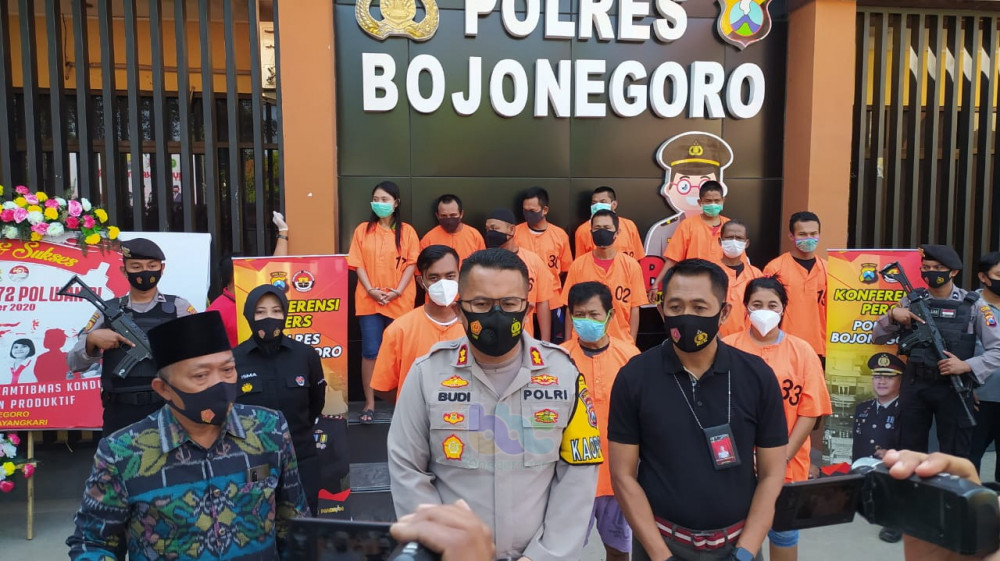 Kapolres Bojonegoro AKBP M Budi Hendrawan SIK MH, didampingi Wakapolres Bojonegoro, Kompol Rendy Surya Aditama SH SIK MH; Kasat Reskrim AKP Iwan Hari Poerwanto, dan Kasubbag Humas, AKP Sri Ismawati, dalam konferensi pers di hadapan sejumlah awak media, Kamis (10/09/2020), di Mapolres Bojonegoro menjelaskan bahwa anggota jajarannya telah berhasil menangkap produsen minuman keras jenis arak, berikut barang bukti ribuan liter arak siap edar.