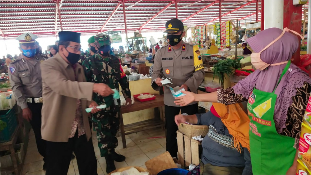 Blora - Kepolisian Resort (Polres) Blora bersama Forum Komunikasi Pemerintah Daerah (Forkopimda) Kabupaten Blora, pada Kamis (10/09/2020), menggelar kegiatan pembagian masker gratis kepada warga masyarakat, di Pasar Rakyat Sido Makmur Kabupaten Blora.