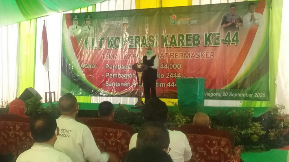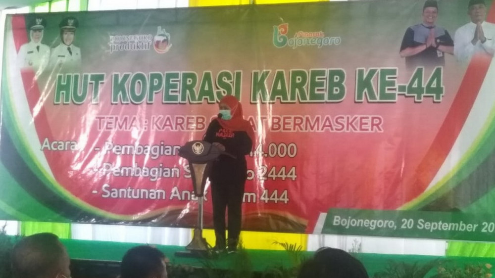Bojonegoro - Gubernur Jawa Timur, Dra Hj Khofifah Indar Parawansa MSi, pada Minggu (20/09/2020), lakukan kunjungan di Bojonegoro, salah satunya mengahdiri Hari Ulang Tahun (HUT) ke-44 Koperasi Karyawan Redrying Bojonegoro (Koperasi Kareb).