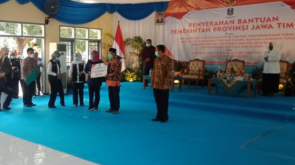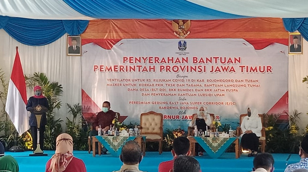 Setelah memberikan sambutan, Gubernur Khofifah Indar Parawansa secara simbolis menyerahkan bantuan kepada perwakilan penerima, yang dilanjutkan dengan Peresmian Geduang East Java Super Corridor (EJSC) yang ada di kawasan perkantoran Bakorwil Bojonegoro.
