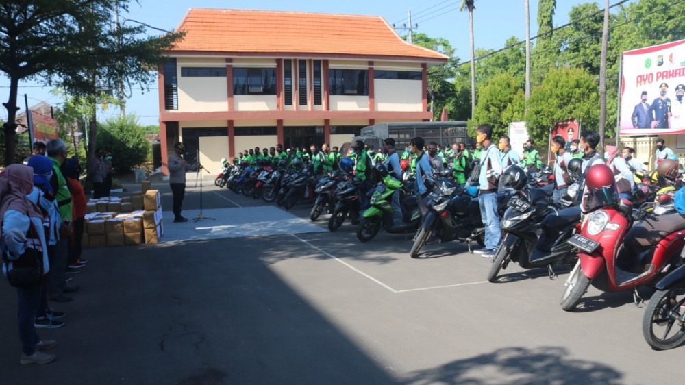 Seratus lebih pekerja ojek online (ojol) yang ada di Bojonegoro, yang menerima bantuan sembako dari Polres Bojonegoro.