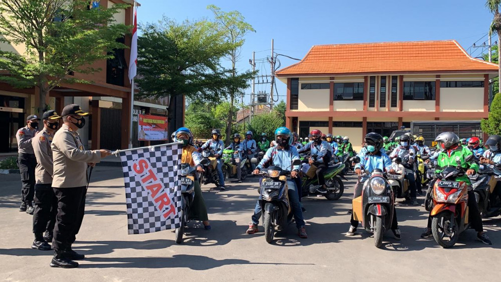 Kapolres Bojonegoro, AKBP M Budi Hendrawan SIK MH, saat berangkatkan para pekerja ojek online (ojol) untuk kembali bekerja. Rabu (30/09/2020)
