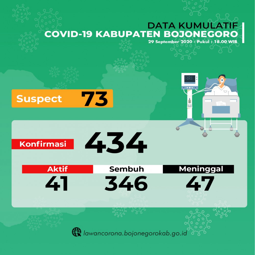 Untuk diketahui, update perkembangan pemantauan virus Corona (Covid-19) di Kabupaten Bojonegoro hingga Selasa (29/09/2020), untuk suspect sebanyak 73 orang. Sementara untuk kasus confirm kumulatif sebanyak 434 orang, meliputi aktif atau yang dirawat 41 orang, sembuh 346 orang dan meninggal dunia 47 orang.