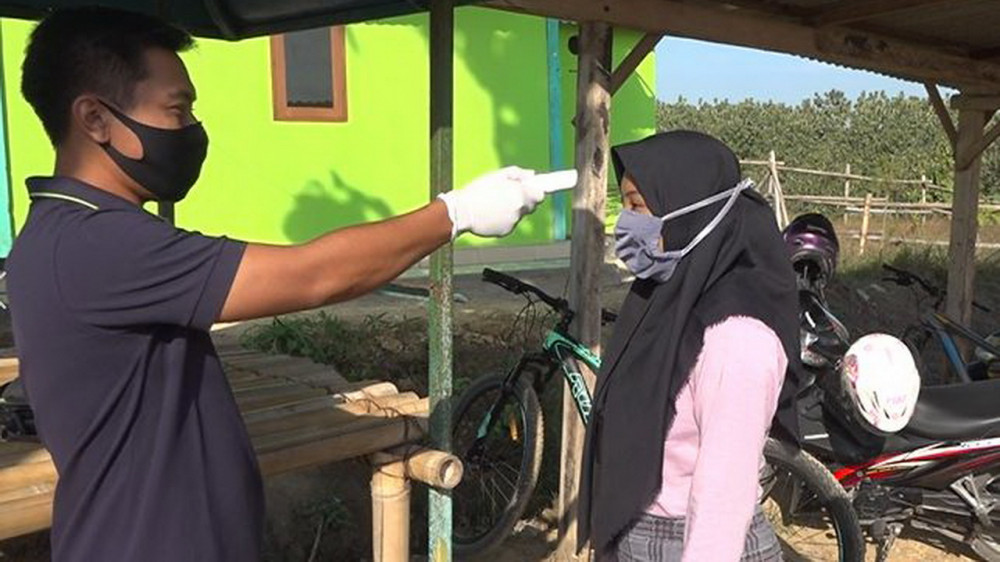 Pengelola Wisata Alam Bukit Kunci di Desa Bangowan Kecamatan Jiken Kabupaten Blora, saat lakukan pengukuran suhu tubuh salah satu pengunjung. Kamis (01/10/2020).