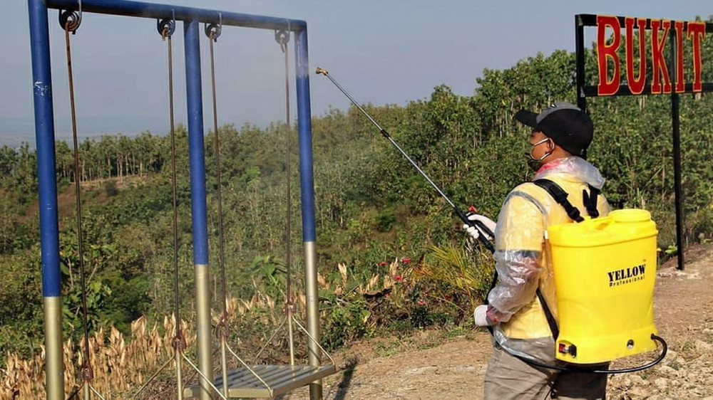 Pengelola Wisata Alam Bukit Kunci di Desa Bangowan Kecamatan Jiken Kabupaten Blora, saat lakukan penyemprotan disinfektan di sejumlah fasilitas Wisata Alam Bukit Kunci. Kamis (01/10/2020).