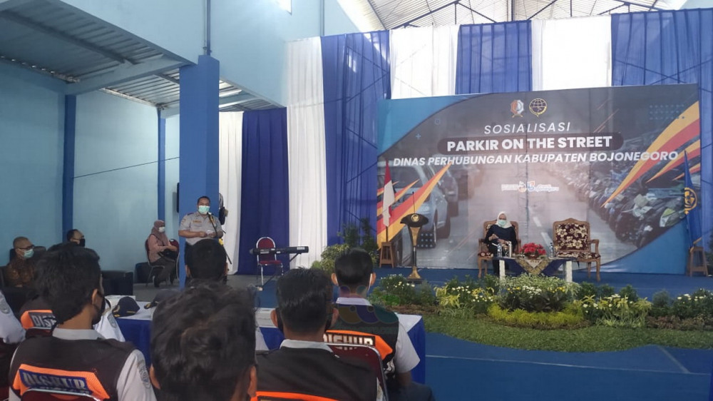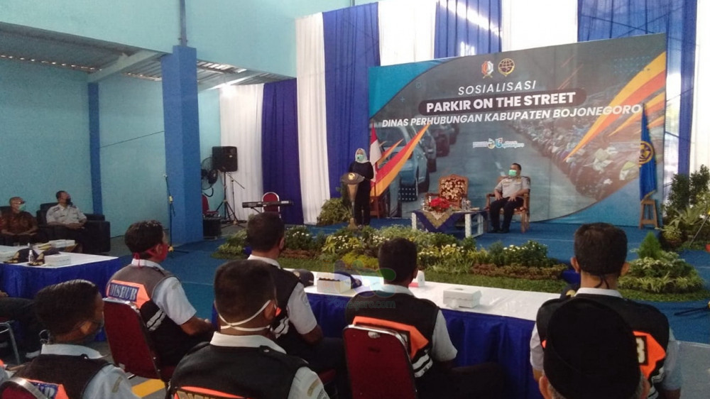 Bojonegoro - Pemerintah Kabupaten (Pemkab) Bojonegoro melalui Dinas Perhubungan (Dishub) Kabupaten Bojonegoro, pada Minggu (04/10/2020) pagi, menggelar sosialisasi 'Parkir on the Street' yang dirangkai dengan pembinaan kepada juru parkir (jukir) yang ada di Kota Bojonegoro.