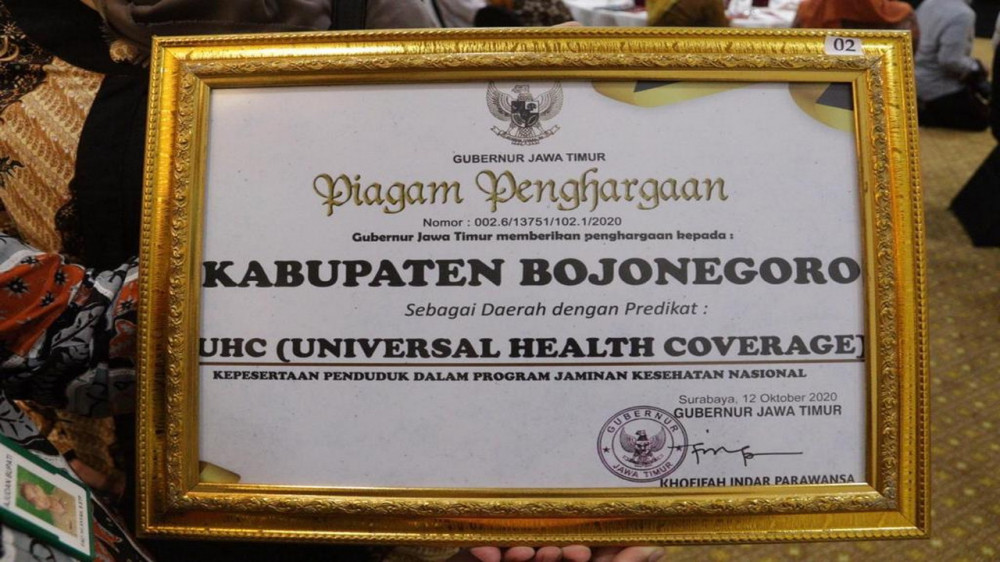 Piagam Penghargaan untuk Kabupaten Bojonegoro sebagai daerah dengan Predikat Universal Health Coverage (UHC) Kepesertaan Penduduk dalam Program Jaminan Kesehatan Nasional.