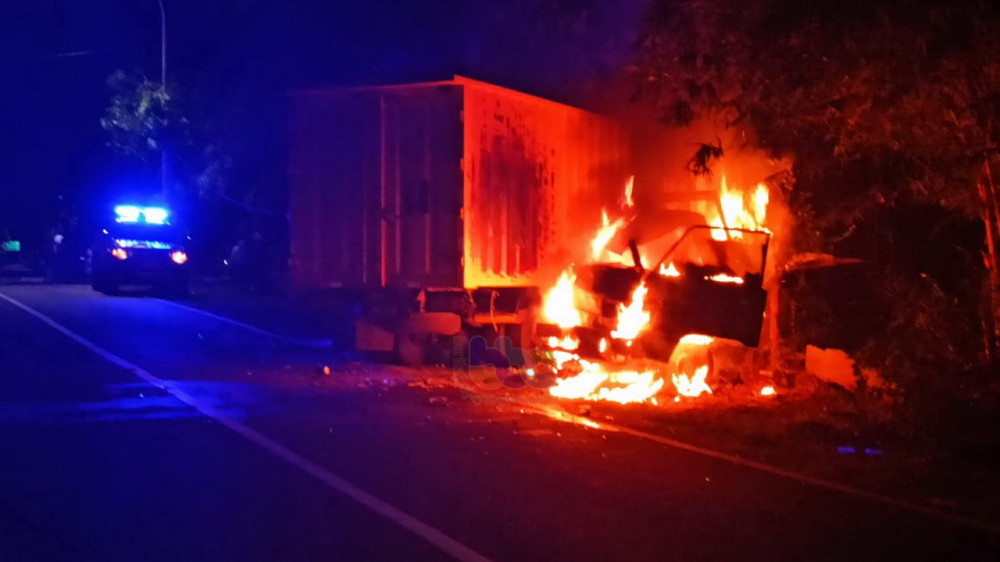 Foto Kecelakaan Lalu-Lintas di Dander Bojonegoro, yang Aklibatkan Mobil Pikap Terbakar