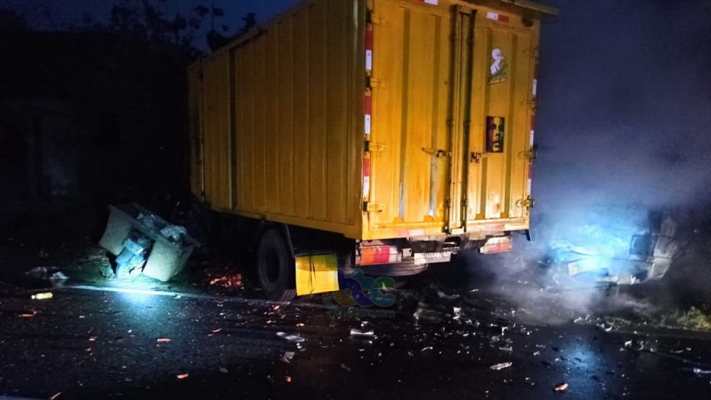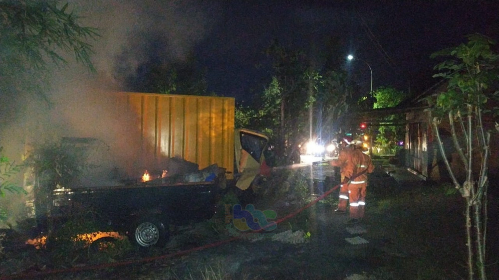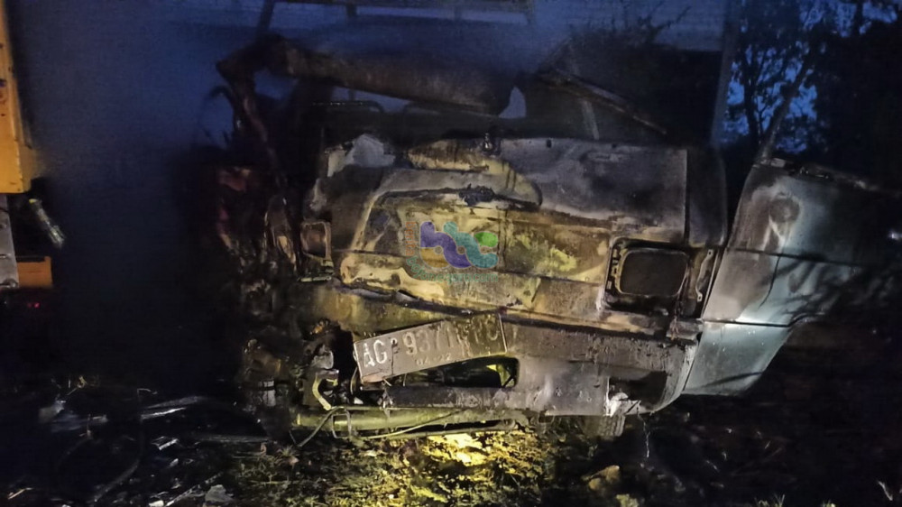 Bojonegoro - Sebuah mobil pikap Mitsubishi L300 pada Minggu (18/10/2020) sekira pukul 04.00 WIB, hangus terbakar, setelah terlibat kecelakaan lalu-lintas beruntun dengan truk boks dan sepeda motor, di jalan raya jurusan Bojonegoro - Nganjuk, turut wilayah Desa Kunci Kecamatan Dander Kabupaten Bojonegoro.