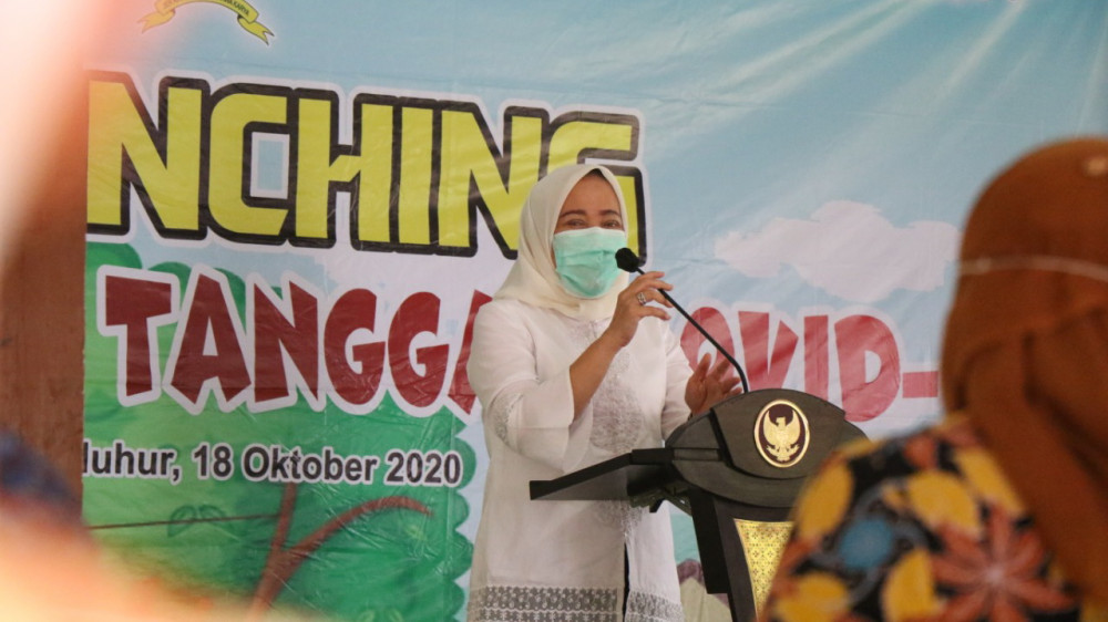 Bupati Bojonegoro, Dr Hj Anna Muawanah, saat beri sambutan dalam acara launching Pencanangan Kampung KB Tanggap Covid-19, di Desa Ngadiluhur Kecamatan Balen Bojonegoro. Minggu (18/10/2020)