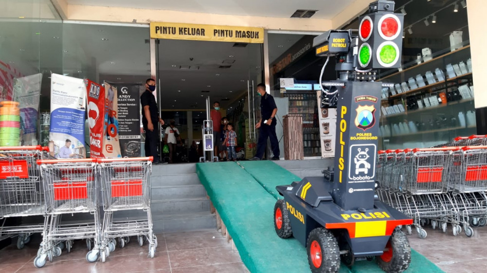 Bojonegoro - Dalam pelaksanaan Operasi Zebra Semeru 2020 di hari keenam, Sabtu (31/10/2020), jajaran Satuan Lalu Lintas (Sat Lantas) Polres Bojonegoro melaksanakan patroli terhadap warga masyarakat yang tidak menggunakan masker, di salah satu Toko Swalayan di Kota Bojonegoro, dengan memanfaatkan inovasi berbasis Informasi Teknologi (IT), yakni robot pintar yang diberi nama Robot Bojonegoro Tangguh atau 'Bobota'.