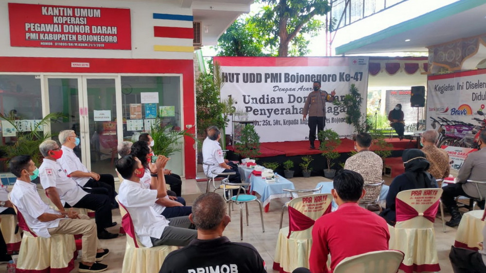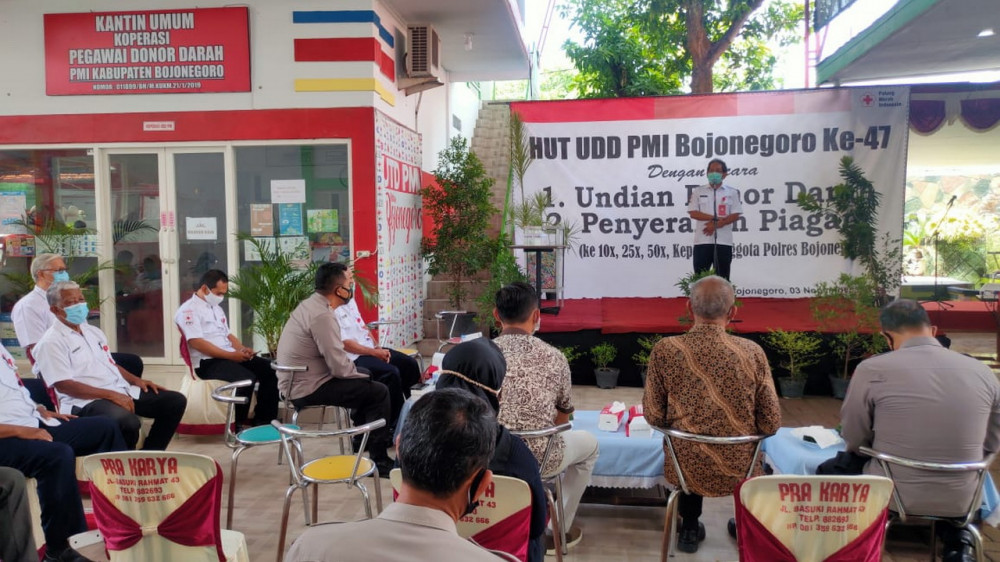 Bojonegoro - Dalam peringatan Hari ulang Tahun (HUT) Unit Donor Darah (UDD) Palang Merah Indonesia (PMI) Bojonegoro ke-47, sebanyak 18 personel Polres Bojonegoro, pada Selasa (03/11/2020), terima penghargaan dari UDD PMI Bojonegoro.