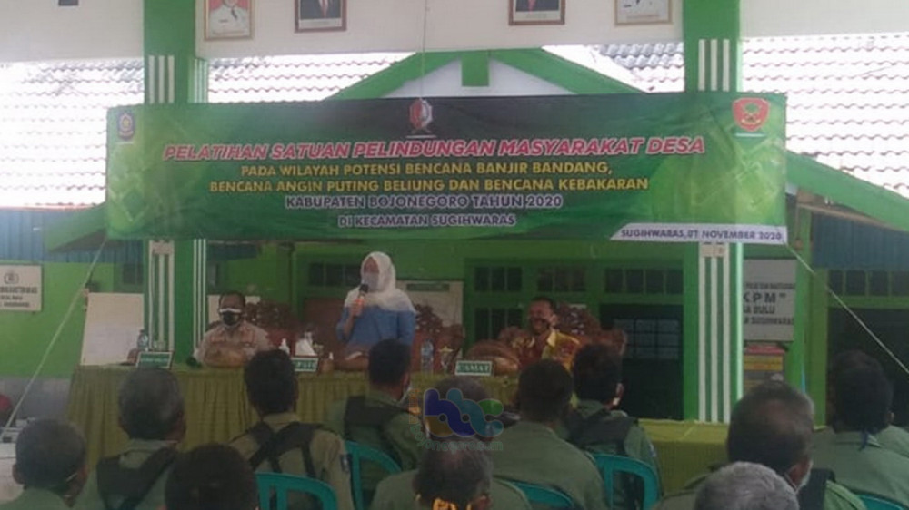 Bojonegoro - Pemerintah Kabupaten (Pemkab) Bojonegoro melalui Satuan Polisi Pamong Praja (Satpol PP) Kabupaten Bojongoro, pada Sabtu (07/11/2020) menggelar Pelatihan penanganan dan Penanggulangan Bencana kepada anggota Satuan Pelindungan Masyarakat (Sat Limnas) Desa pada wilayah potensi bencana banjir bandang, bencana angin puting beliung, dan bencana kebakaran, di wilayah Kecamatan Sugihwaras.