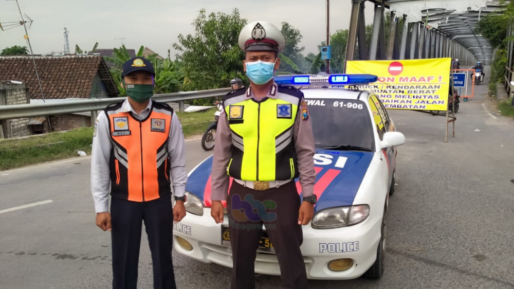 Petugas gabungan dari Sat Lantas Polres Bojonegoro dan Dinas Perhubungan Kabupaten Bojonegoro, saat lakukan penjagaan di Jembatan Glendeng, setelah dibuka untuk kendaraan roda 2 dan pejalan kaki. Senin (09/11/2020)