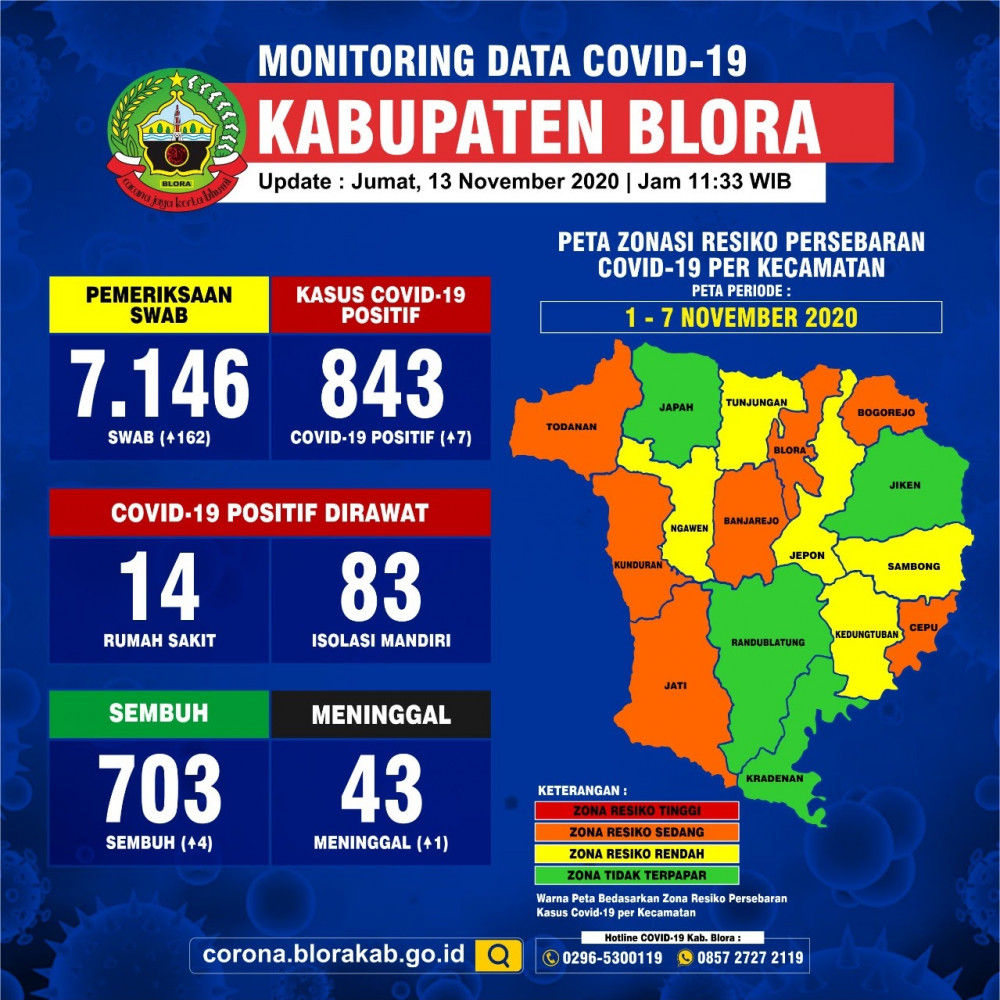 Infografis data perkembangan dan peta persebaran Virus Corona (Covid-19) di Kabupaten Blora hingga Jumat (13/11/2020)