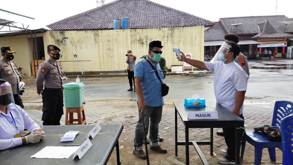 “Disimulasikan pemilih yang datang ke TPS langsung mencuci tangan dengan sabun atau handsanitizer yang telah disediakan dan dikeringkan (dilap dengan ditisu) dan pemilih diukur suhu tubuhnya oleh Petugas KPPS,” kata Kabag Ops Kompol Supriyo.