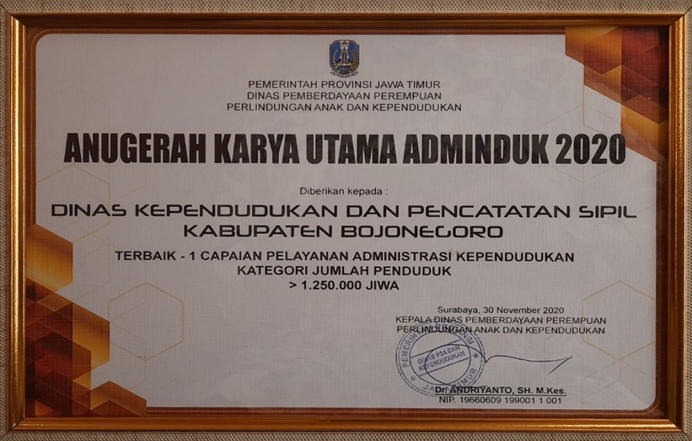 Bojonegoro - Dinas Kependudukan dan Pencatatan Sipil (Disdukcapil) Kabupaten Bojonegoro meraih penghargaan Anugerah Karya Utama Adminduk 2020, dari Dinas Pemberdayaan Perempuan Perlindungan Anak dan Kependudukan (DP3AK) Provinsi Jawa Timur.