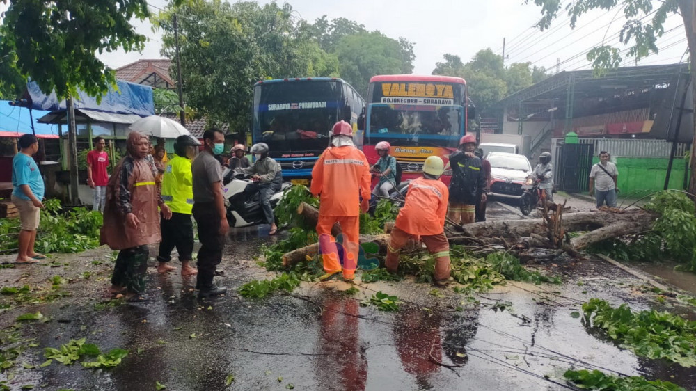 Bojonegoro - Akibat hujan deras yang disertai angin kencang yang terjadi Rabu (03/12/2020) seklira pukul 13.30 WIB, mengkibatkan sebatang pohon penghijauan yang berada di pinggir ruas jalan raya Bojonegoro - Babat, turut Desa Pasinan Kecamatan Baureno Kabupaten Bojonegoro, tumbang atau roboh di badan jalan, sehingga arus lalu-lintas di jalur tersebut sempat tersendat.