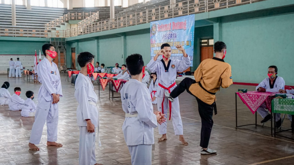 Blora - Pengurus Cabang (Pengcab) olahraga Taekwondo Indonesia (TI) Kabupaten Blora, pada Minggu (13/12/2020) menggelar ujian kenaikan tingkat (UKT) bagi atlet taekwondo di kabupaten setempat.