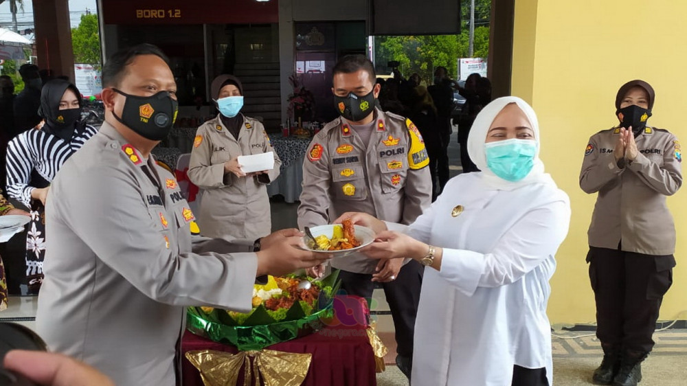Kapolres Bojonegoro, AKBP Eva Guna Pandia SIK MM MH saat serangkan potongan tumpeng kepada Bupati Bojonegoro Dr Hj Anna Muawanah, di Mapolres Bojonegoro. Selasa (22/12/2020) (foto: imam/beritabojonegoro)