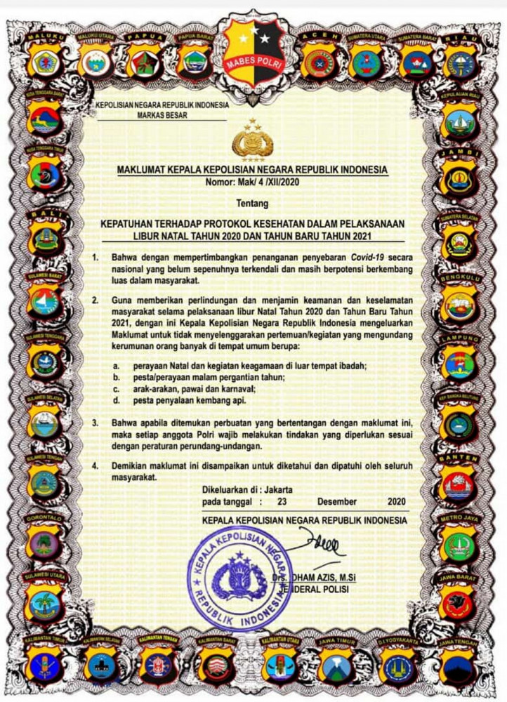 Maklumat Kapolri, tentang Kepatuhan Terhadap Protokol Kesehatan dalam Pelaksanaan Libur Natal dan Tahun Baru 2021