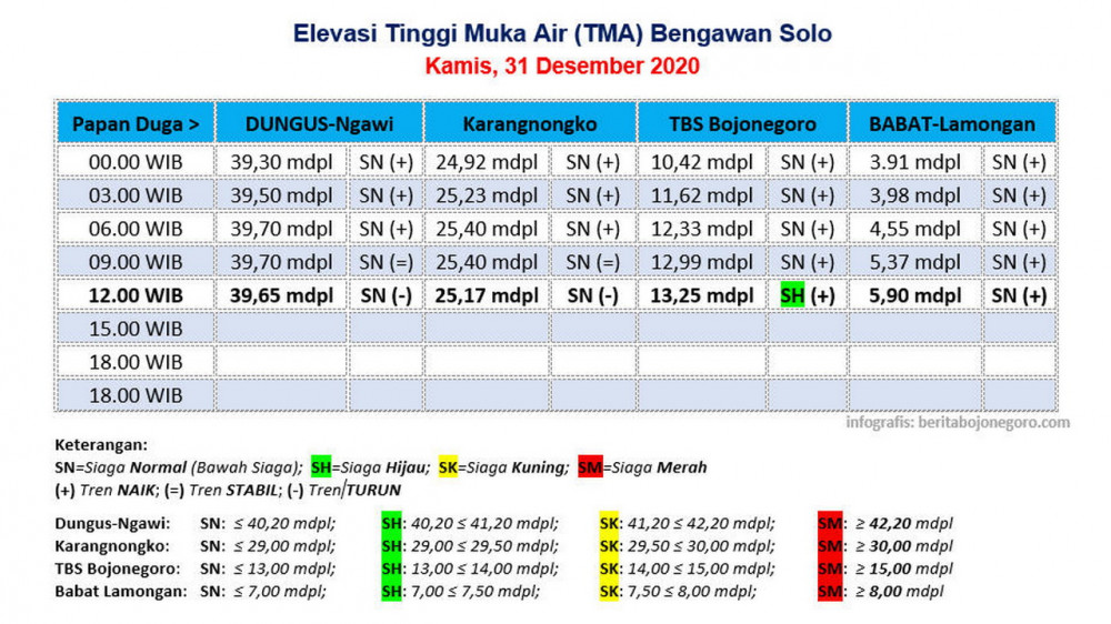 Kepala pelaksana (Kalak) BPBD Kabupaten Bojonegoro, Nadif Ulfia SSos, menyampaikan bahwa elevasi Tinggi Muka Air (TMA) Bengawan Solo pada papan duga Taman Bengawan Solo (TBS) Bojonegoro Kota pada Kamis (31/12/2020) pukul 12.00 WIB, berada pada ketinggian 13,25 meter di atas permukaan air laut (mdpl), atau telah memasuki status siaga hijau, dengan tren masih mengalami kenaikan.