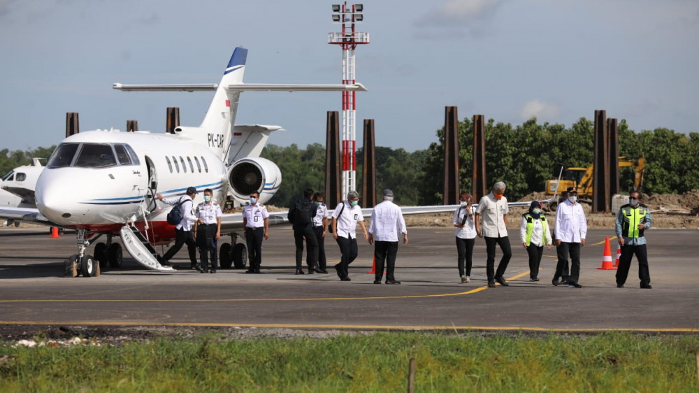Menteri PUPR Basuki Hadimuljono dan Menteri Perhubungan Budi Karya Sumadi, serta Gubernur Jawa Tengah Ganjar Pranowo, tiba di Bandara Ngloran menggunakan pesawat jet pribadi jenis Hawker 900 XP PC-KR, pada Minggu (03/01/2021) pagi.