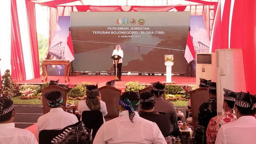 Bupati Bojonegoro Anna Muawanah, saat beri sambutan dalam peresmian Jembatan Terusan Bojonegoro-Blora (TBB), Minggu (03/01/2021). (foto: dan/beritabojonegoro)