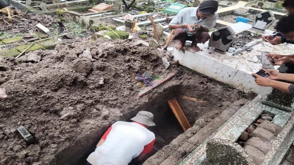 "Pas menggali terus kelihatan jenazahnya. Masih utuh, kepalanya juga masih utuh. Terus saya tutup lagi," kata Sumaji.