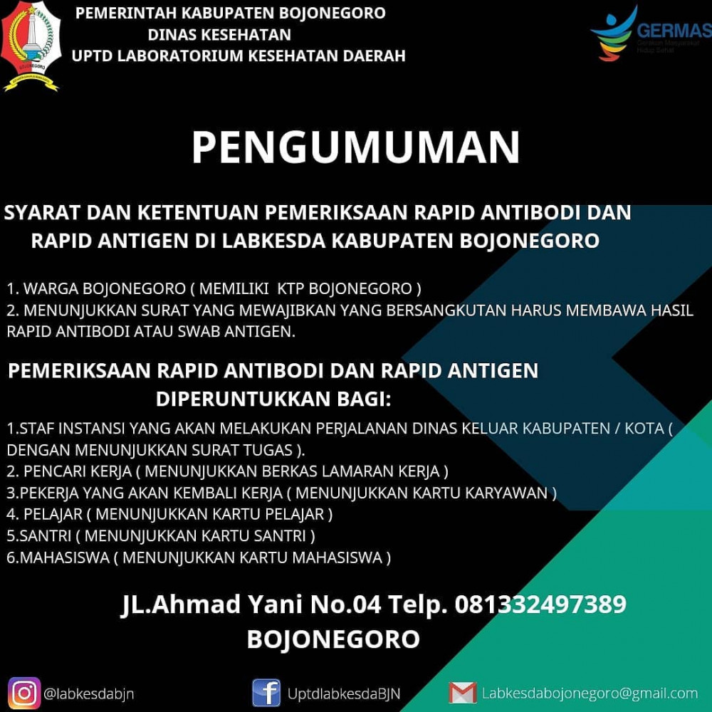 Adapun syarat dan ketentuan pemeriksaan rapid antibodi dan rapid antigen di Labkesda Bojonegoro antara lain: 1). Warga Bojonegoro (memiliki KTP Bojonegoro) dan 2). Menunjukkan surat yang mewajibkan yang bersangkutan harus membawa hasil rapid antibodi atau swab antigen