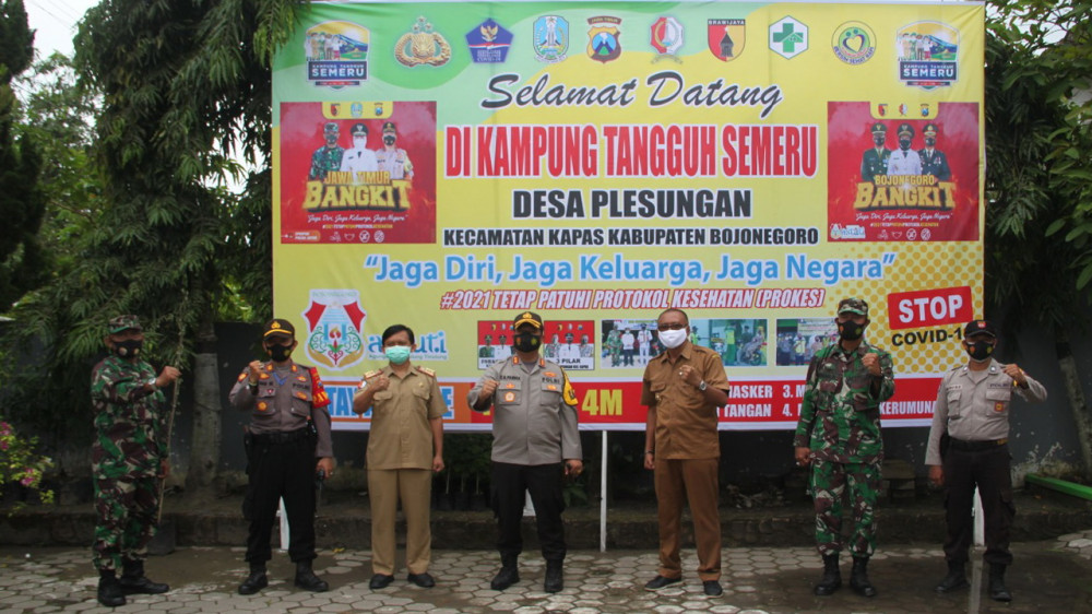 “Tak hanya mencegah penyebaran COVID-19, Program Kampung Tangguh Semeru juga memberikan sarana masyarakat untuk menyelesaikan segala permasalahan yang ada di desa. Kita imbau kepada warga masyarakat Bojonegoro tetap mematuhi protokol kesehatan,” kata AKBP EG Pandia.