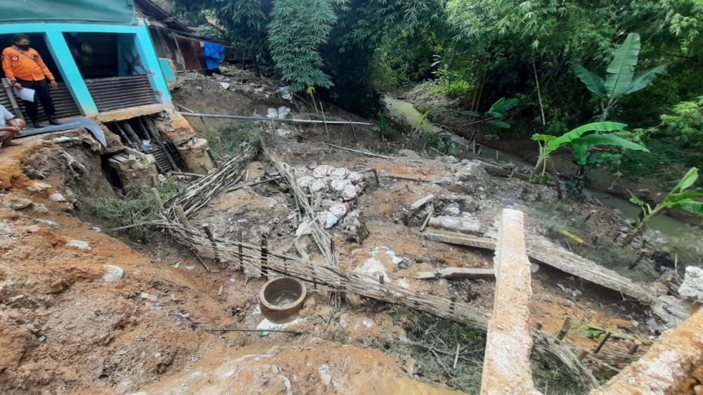 Akibat gerusan arus sungai tersebut menjadikan satu rumah warga bernama Heru (41), yang berada di tepi sungai tersebut terancam ambruk akibat tebing sungai longsor.
