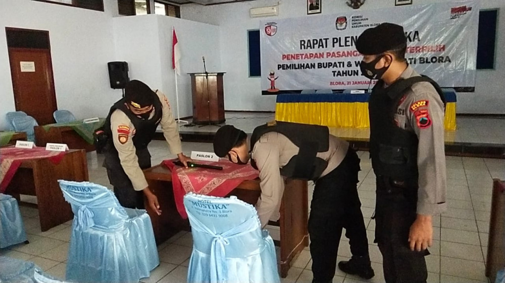 Aparat kepolisian Polres Blora, saat lakukan sterilisasi lokasi pelaksanaan Rapat Pleno Terbuka Penetapan Pasangan Calon Bupati dan Wakil Bupati Terpilih, dalam Pilkada 2020. (foto: istimewa)