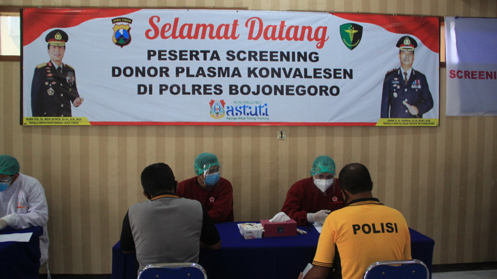 Kapolres Bojonegoro, AKBP Eva Guna Pandia SIK MM MH, melalui Paur Kesehatan Polres Bojonegoro, Aipda Agung Basuki menjelaskan bahwa Polres Bojonegoro bekerjasama dengan Palang Merah Indonesia (PMI) Cabang Bojonegoro menggelar skrining donor plasma konvalesen, terhadap anggota Polres Bojonegoro yang dinyatakan telah sembuh setelah terpapar COVID-19.