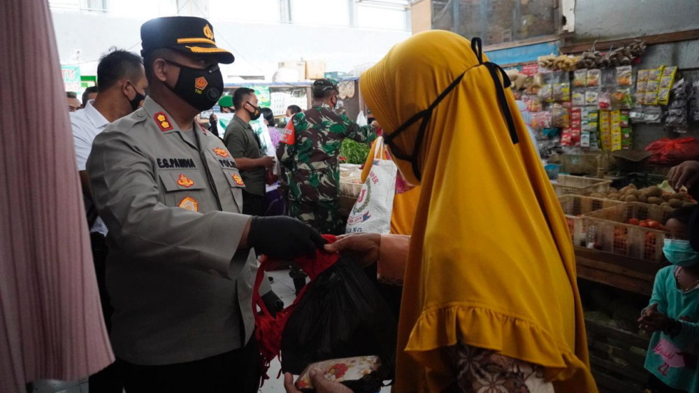 Dalam kesempatan tersebut, Kapolres dan Dandim berkeliling ke sudut-sudut pasar. Tak sekadar menyapa para pedagang maupun pengunjung pasar. Kapolres dan Dandim juga membagikan masker kepada warga sambil mengimbau agar warga masyarakat mematuhi protokol kesehatan, utamanya memakai masker saat beraktivitas di luar rumah.