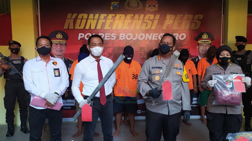 Kapolres Bojonegoro AKBP Eva Guna Pandia SIK MH MM, dalam konferensi pers di Mapolres Bojonegoro Senin (15/02/2021) mengungkapkan bahwa anggota jajarannya bersama Tim Kejahatan dan Kekerasan (Jatanras) Polda Jatim, Polres Sampang, dan juga Polres Karanganyar, berhasil mengamankan 7 orang tersangka pengeroyokan yang sebelumnya telah ditetapkan DPO.